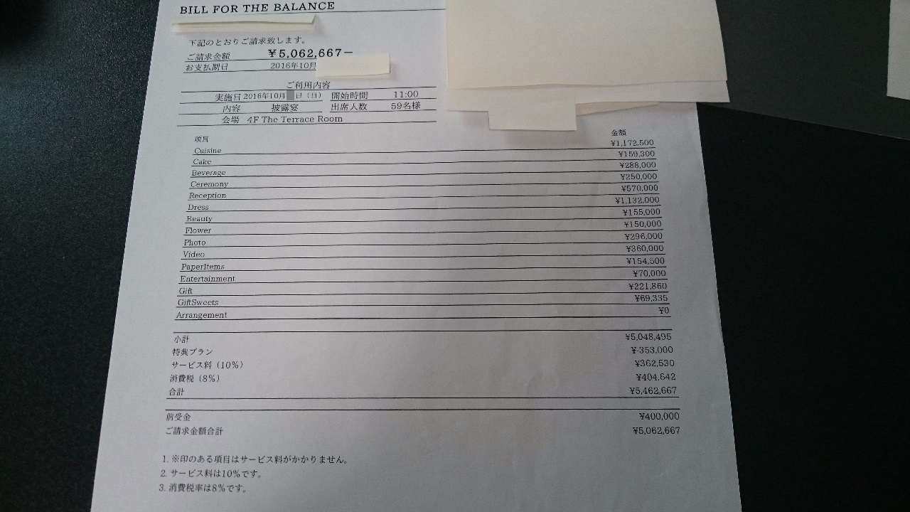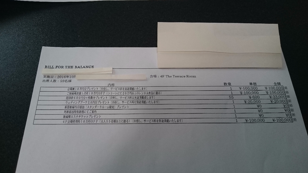 ※投稿された金額情報は、日取り、申込みのタイミングや会場の空き状況等によって異なるため、最終費用明細の項目や金額をもとにした、式場との価格交渉や追加サービス等の要望はご遠慮ください。