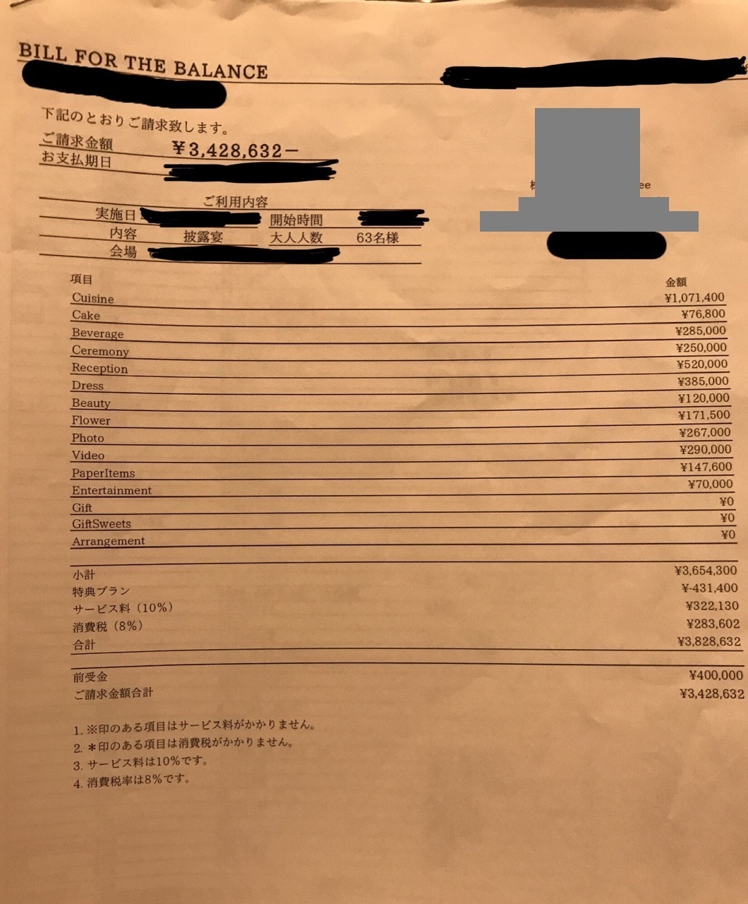 ※料金実例では申込金などを含む会場に支払った"総額"を表示しています。また、料金明細画像の項目名をもとに独自の基準で分類しています。