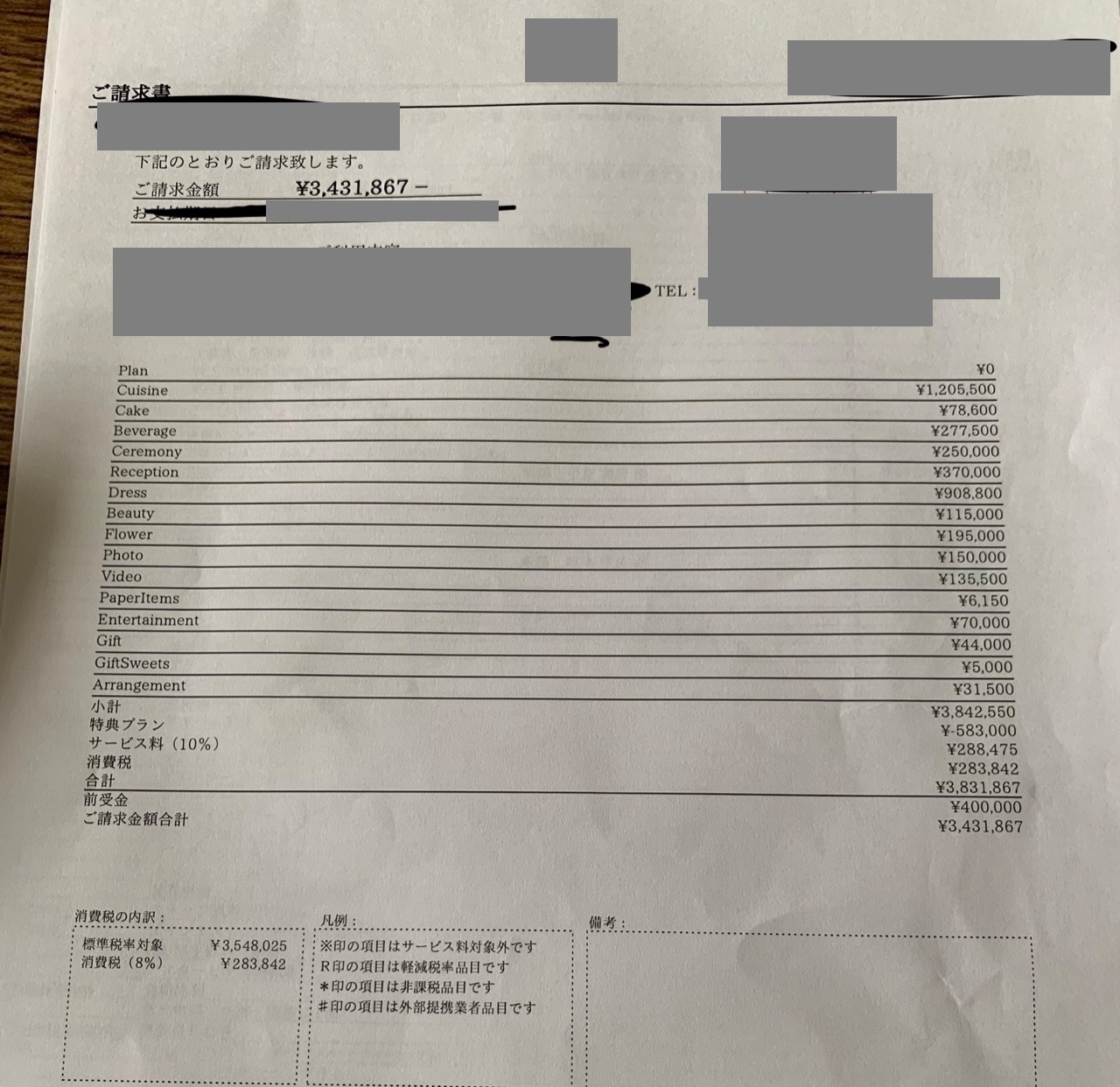 ※料金実例では申込金などを含む会場に支払った"総額"を表示しています。また、料金明細画像の項目名をもとに独自の基準で分類しています。