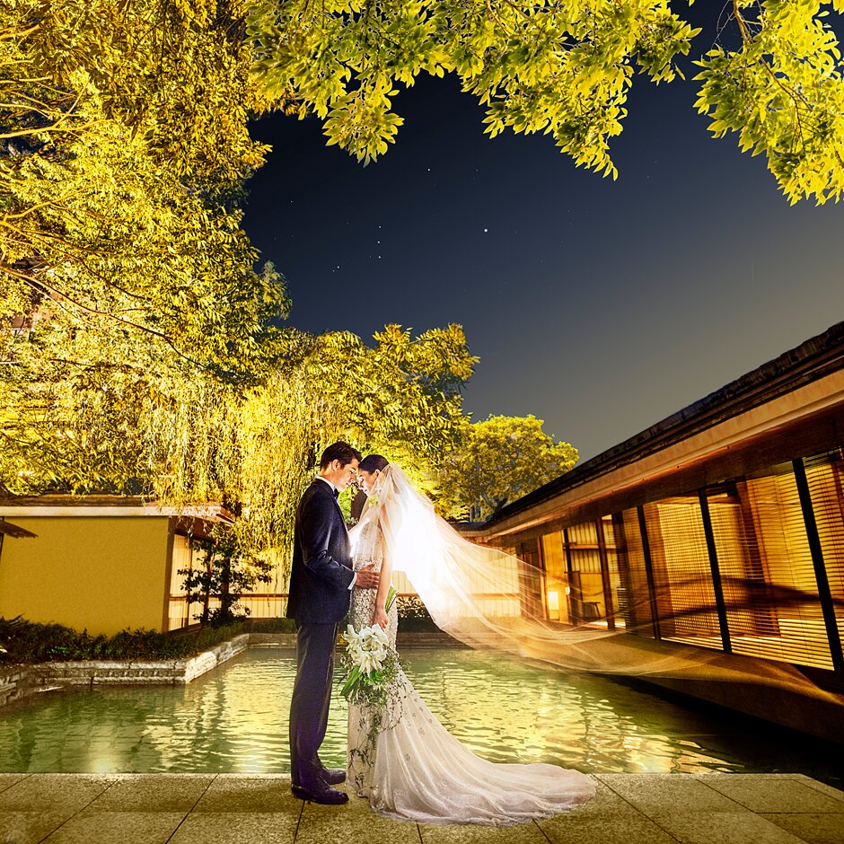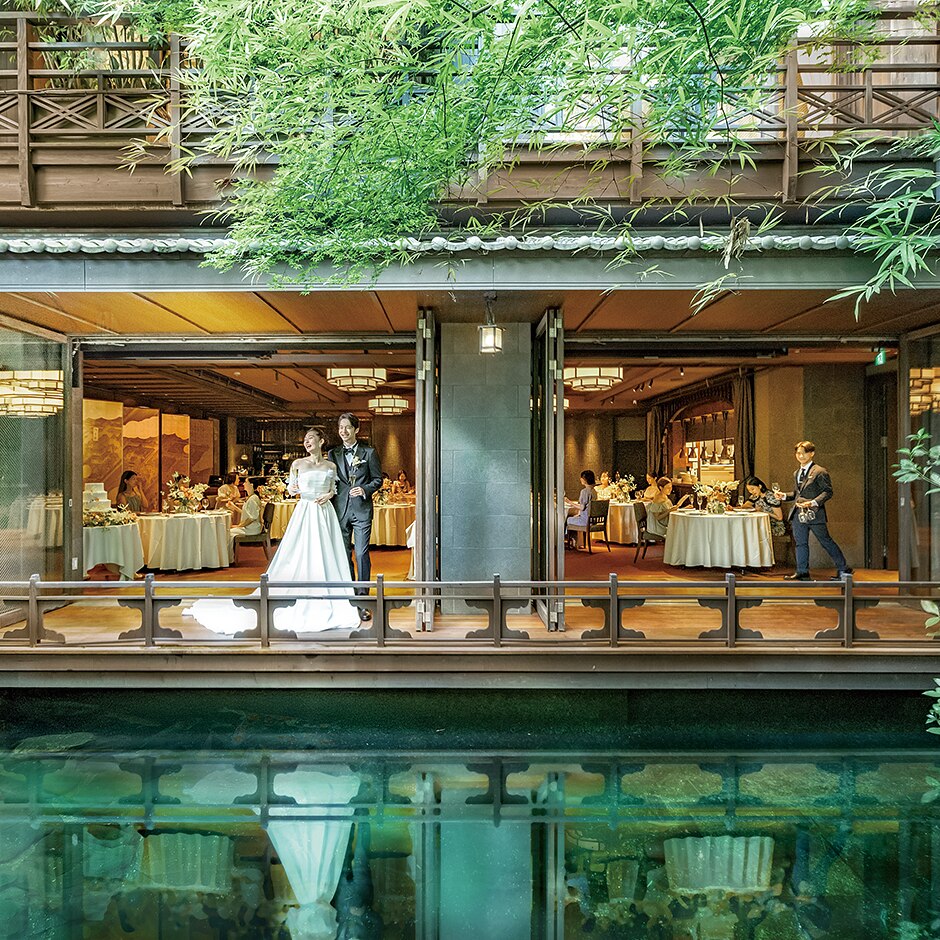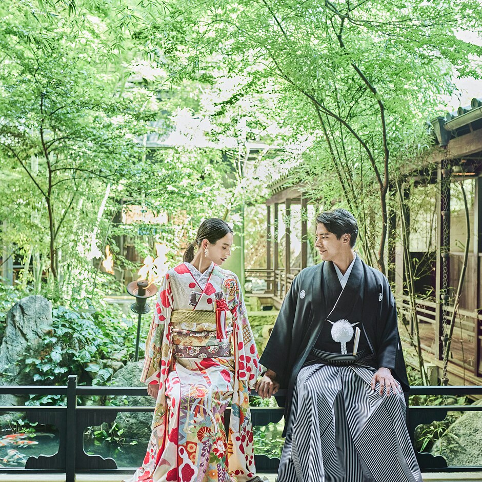 窓外に広がる日本庭園は四季折々に美しく、絶好の前撮りスポットとしても活躍。記憶に残るシーンになるはず