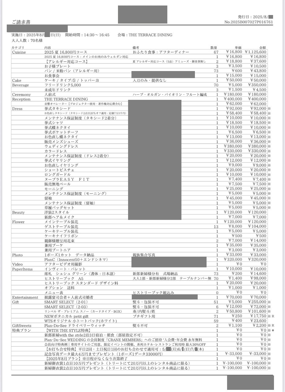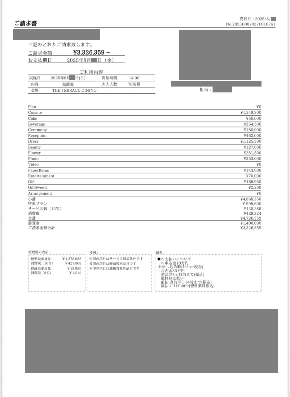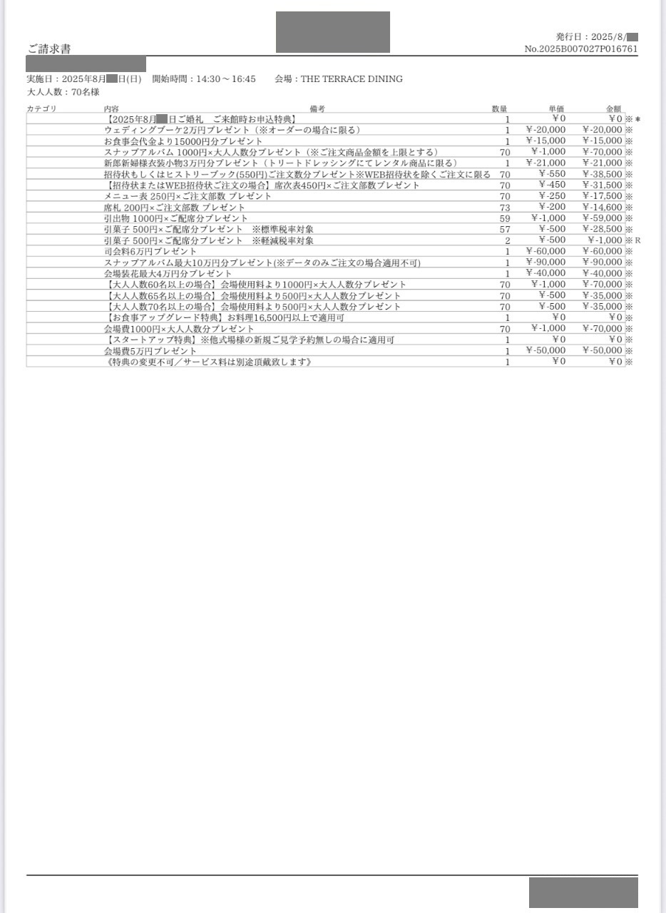 ※投稿された金額情報は、日取り、申込みのタイミングや会場の空き状況等によって異なるため、最終費用明細の項目や金額をもとにした、式場との価格交渉や追加サービス等の要望はご遠慮ください。