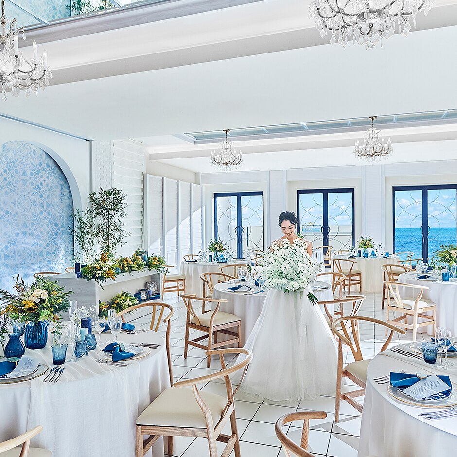 パーティ会場は、6~27名の少人数婚向け会場から、100名までの大人数ゲストをもてなせる披露宴会場まで3タイプ揃い、どの会場からも青い海を一望できる。ふたりの希望にあわせたスタイルで貸切パーティを楽しんで。