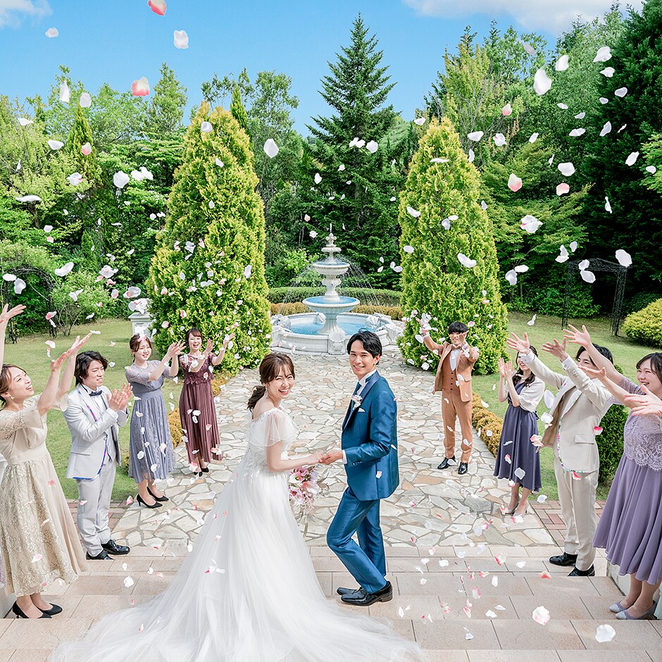涼し気な噴水の音と鳥のさえずりがふたりの幸せを祝福してくれているよう。 -