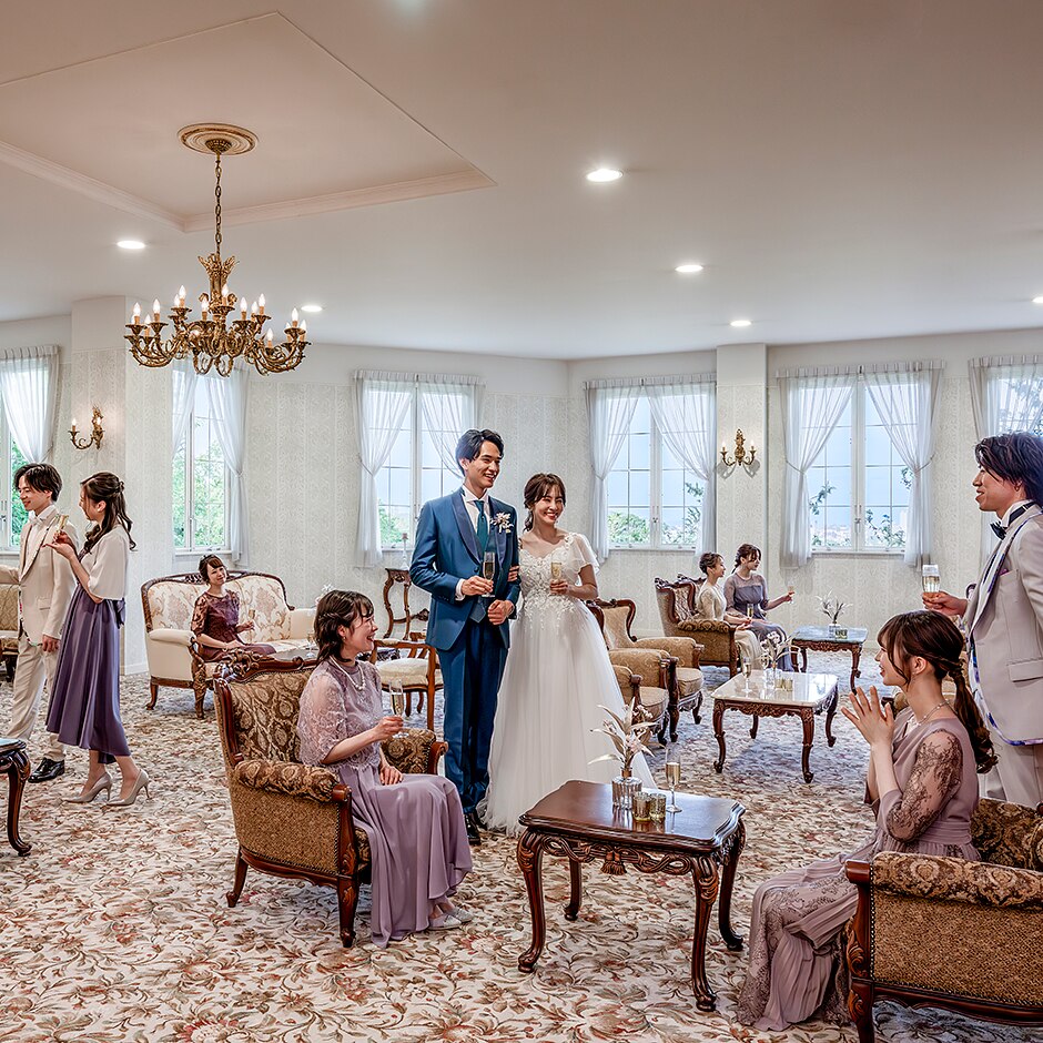 ウェイティングスペースはゲスト全員がゆったり座れるほど広々。挙式2時間前から貸切スタート。 -
