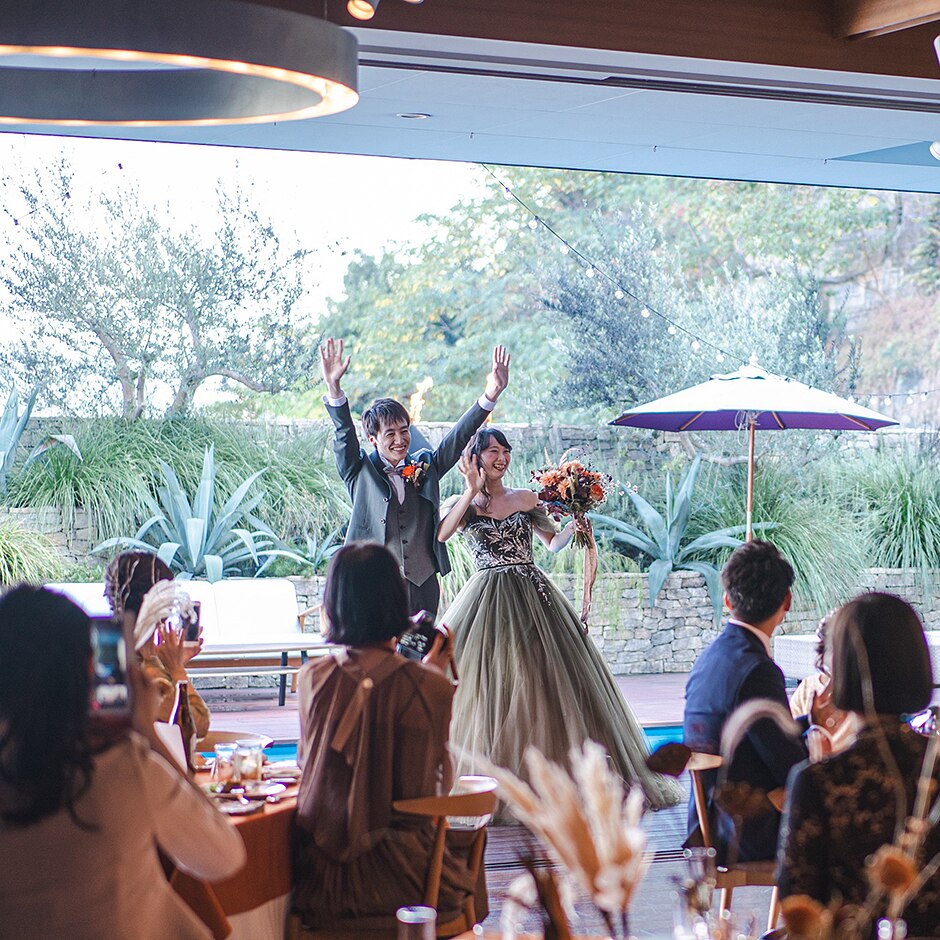 ふたりの人生をなぞる映像演出が話題の《星降るチャペル》。森から海へ吹き抜ける風の道まで丁寧にデザインしたこだわりのパーティ会場。「ゲストと心地よく過ごすこと」をシンプルに追及したスタイリッシュ空間で、ふたりらしいプライベート感あふれる1日を