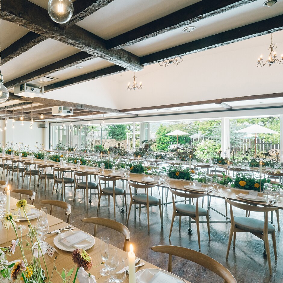 木のテーブルは、海外でもトレンドになっているクロスを使わないコーディネートにぴったり。ガーデンと会場はひと続きにできるから、屋内外を行き来しながら自由にゲストとふれあって/少人数~100名規模OK