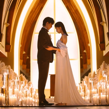 キャンドルの灯りに包まれた夜のチャペルは、とってもロマンチック。昼間とはひと味違う特別な雰囲気の中で、大切な誓いを叶えられます。小倉駅直結だからアクセスも抜群で、ゲストも迷わず安心して来られるのも嬉しいポイント。結婚式のイメージがふくらむフェアでは、参加特典としてホテルペアディナー招待券をプレゼント。