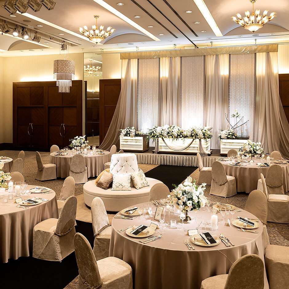 ゆったりした上質な会場を大人数で、ホテルの大会場だからこそ可能な贅沢な空間。最上のおもてなし空間と上品でエレガントなコーディネートが特別なひとときを演出します。 -