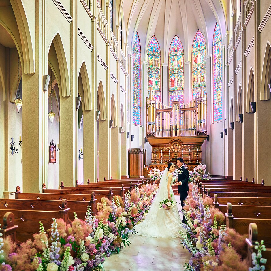 祭壇奥のステンドグラスから煌びやかな祝福の光が降り注ぎ、ふたりの新たな人生を祝福してくれる