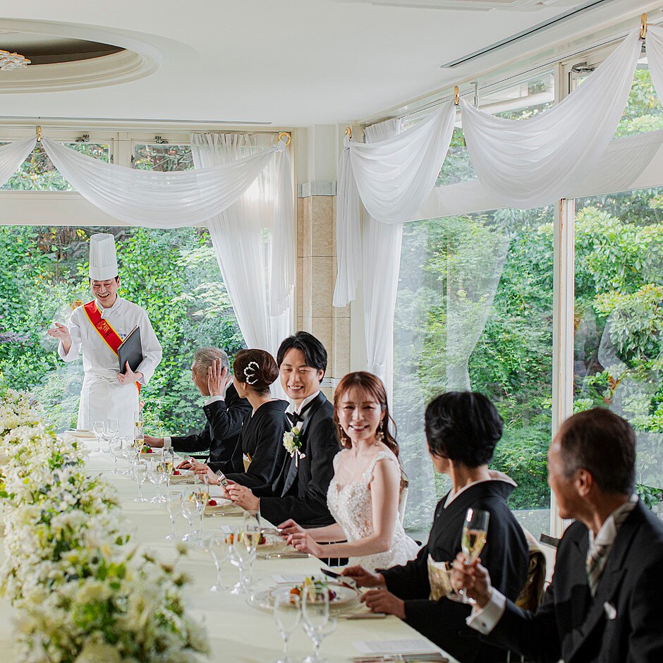 披露宴前半には日本料理会席が登場しお色直しとともにフランス料理へ変わる、贅沢な二部構成の婚礼料理。オープンキッチン付きのパーティ会場では、臨場感あふれる料理パフォーマンスの特別なおもてなしも叶う。