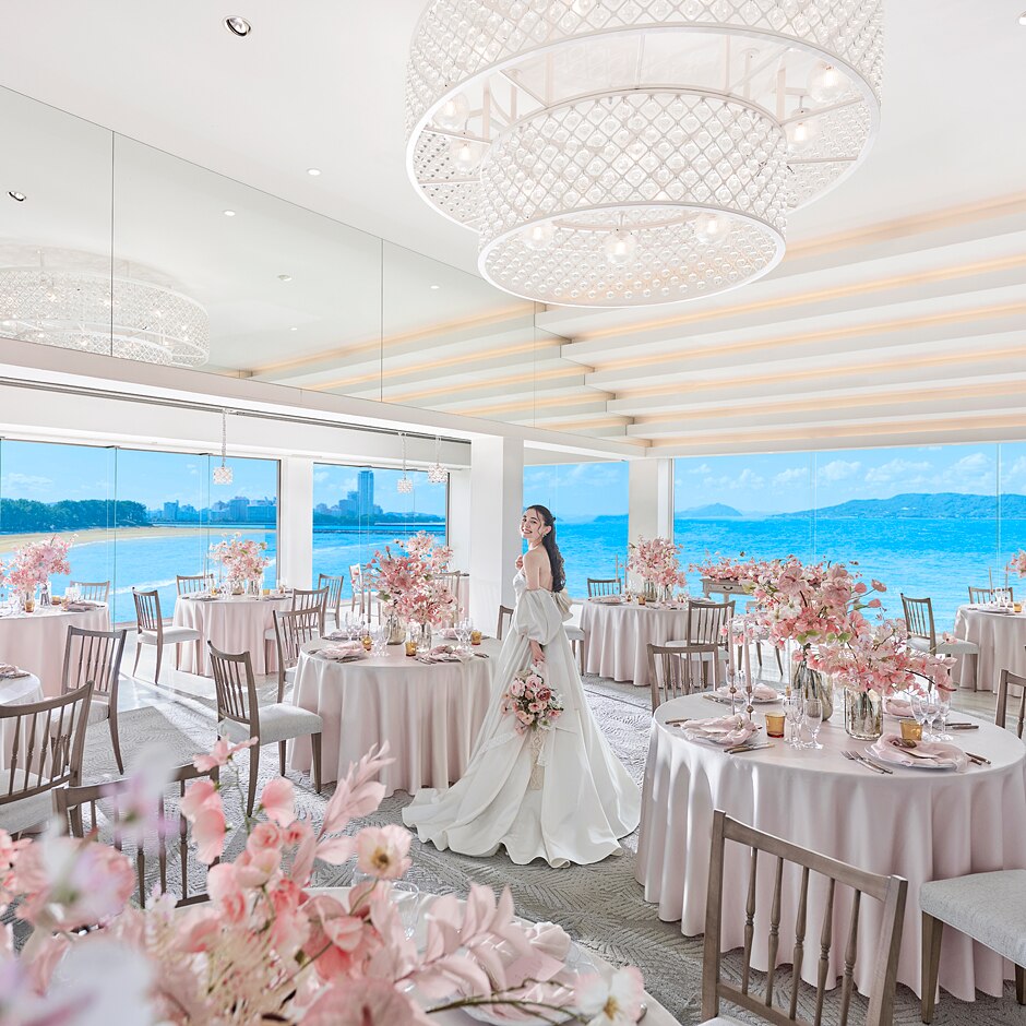 3面の大きな窓に囲まれて、美しい海の眺望の中で叶うウェディング。この場所に招待されること自体がおもてなしになるようなゲスト満足度の高い会場。