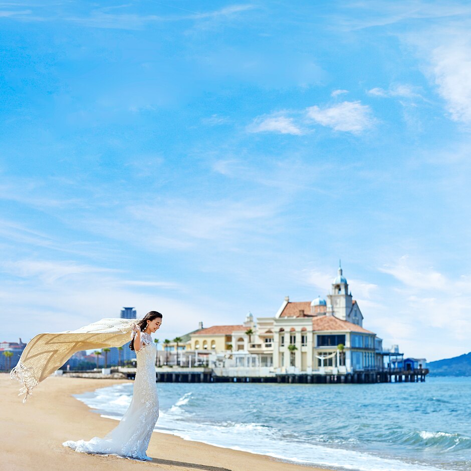ももち浜の白い砂浜、絶景のロケーション。 海上に佇む邸宅は、東洋のモンサンミッシェルと称されます。 ここにしかない非日常をウェディングに。
