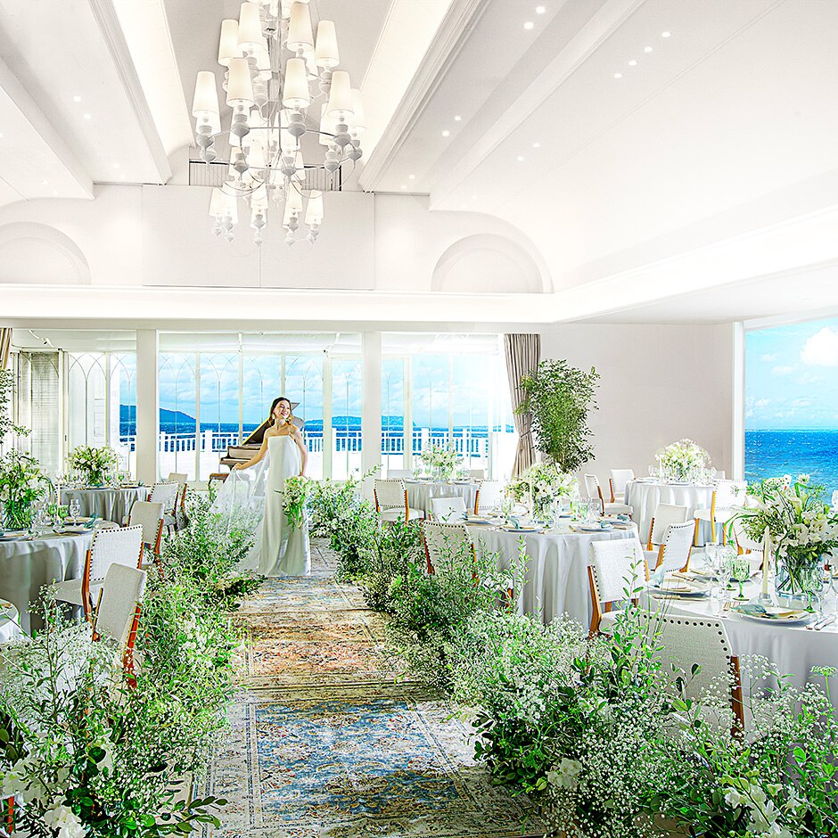 3面の大きな窓に囲まれて、美しい海の眺望の中で叶うウェディング。この場所に招待されること自体がおもてなしになるようなゲスト満足度の高い会場。