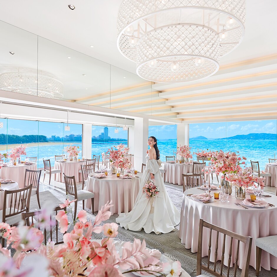 3面の大きな窓に囲まれて、美しい海の眺望の中で叶うウェディング。この場所に招待されること自体がおもてなしになるようなゲスト満足度の高い会場。