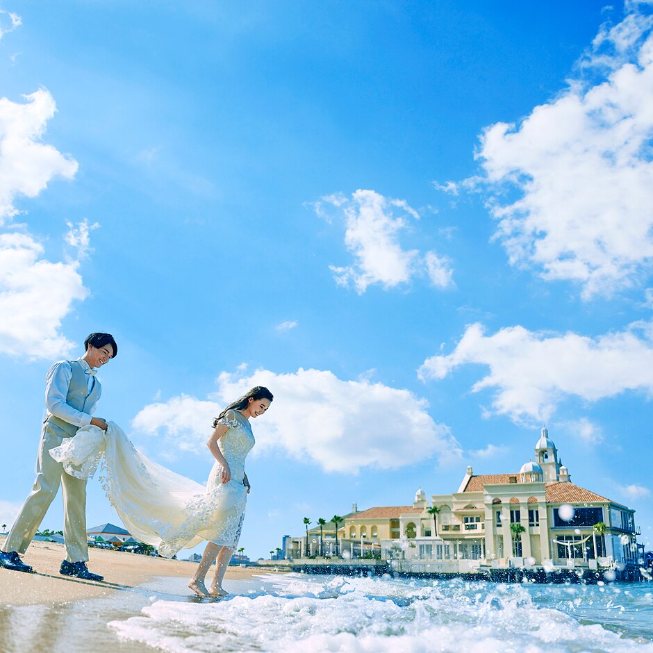 ももち浜の白い砂浜、絶景のロケーション。 海上に佇む邸宅は、東洋のモンサンミッシェルと称されます。 ここにしかない非日常をウェディングに。