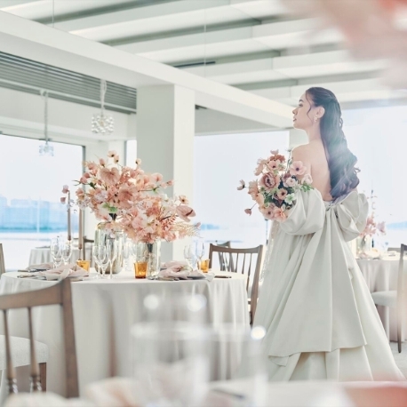 【午前フェアが断然お得】全てのパーティ会場、大聖堂&チャペルを見学OK。本番直前の装飾が見学できる事も!海に浮かぶ会場でリゾートW体験&糸島フレンチ無料試食付〈1軒目見学限定〉人気ドレス33万円分プレゼント