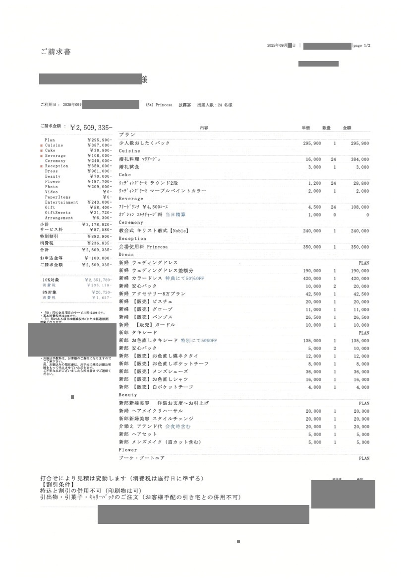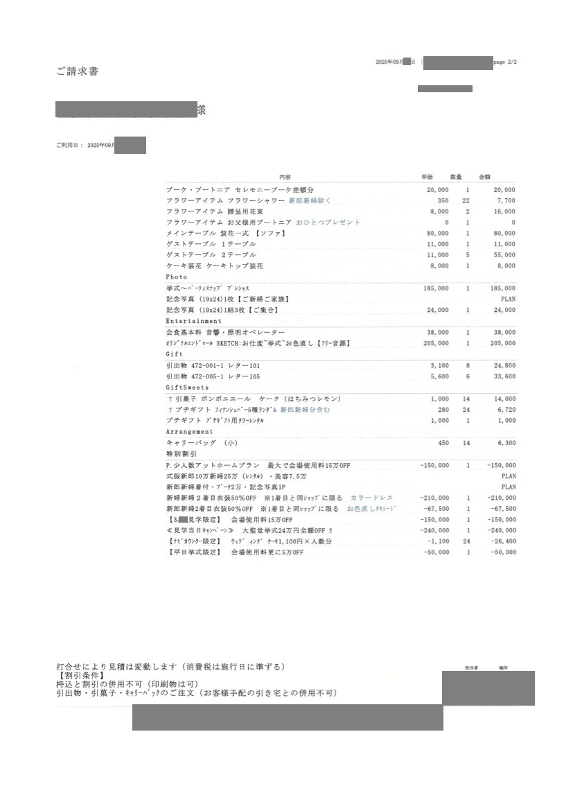 ※投稿された金額情報は、日取り、申込みのタイミングや会場の空き状況等によって異なるため、最終費用明細の項目や金額をもとにした、式場との価格交渉や追加サービス等の要望はご遠慮ください。