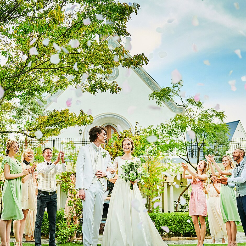 広大なガーデンでゲストに囲まれながら祝福のフラワーシャワー♪