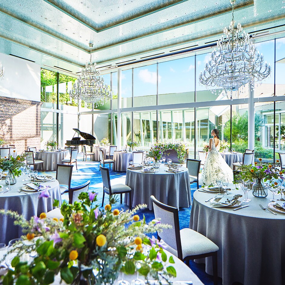 天井高8mの自然光が明るく差し込むパーティ会場