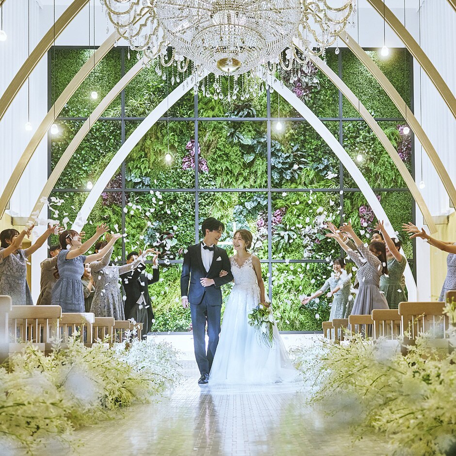 アーチ型の曲線が美しい、全天候型のウエディングが叶うチャペル。華やかなシャンデリアがバージンロードを歩く花嫁をより一層輝かせ、色鮮やかなグリーンウォールが誓いのシーンを幻想的に演出する。