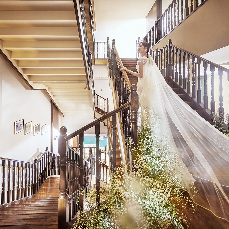 クラシカルな階段に佇むだけで、花嫁を美しく引き立たせます -