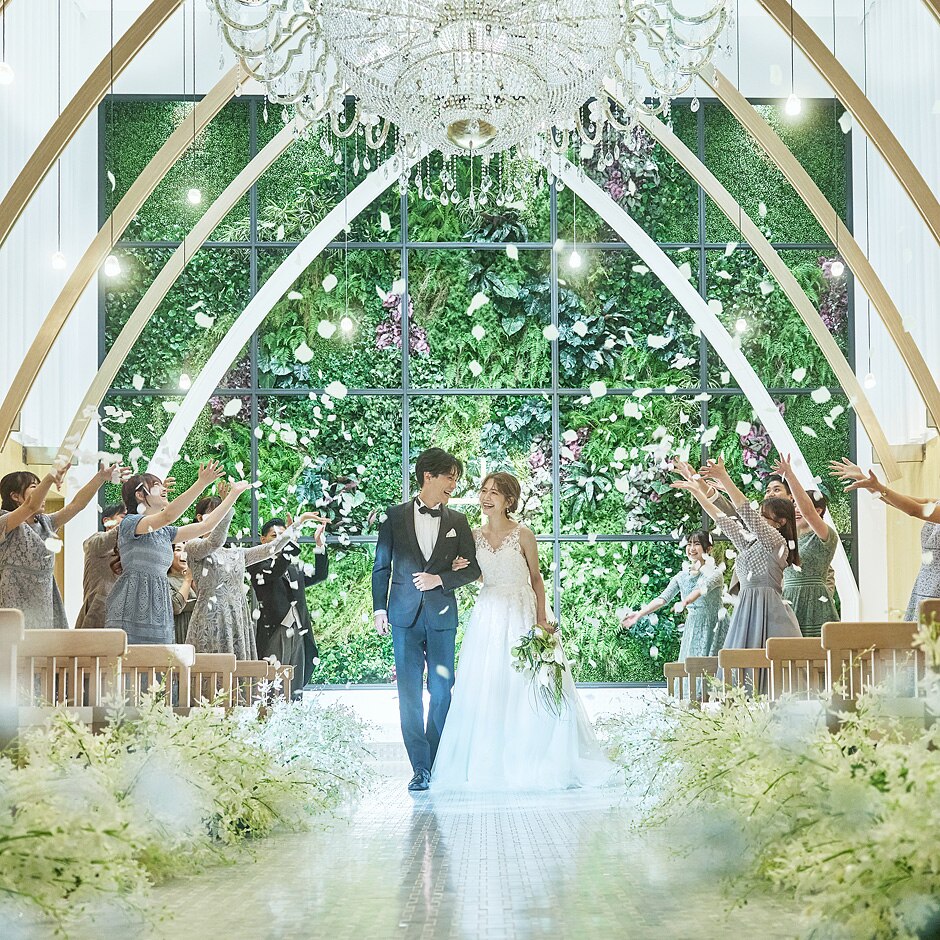 アーチ型の曲線が美しい、全天候型のウエディングが叶うチャペル。華やかなシャンデリアがバージンロードを歩く花嫁をより一層輝かせ、色鮮やかなグリーンウォールが誓いのシーンを幻想的に演出する。