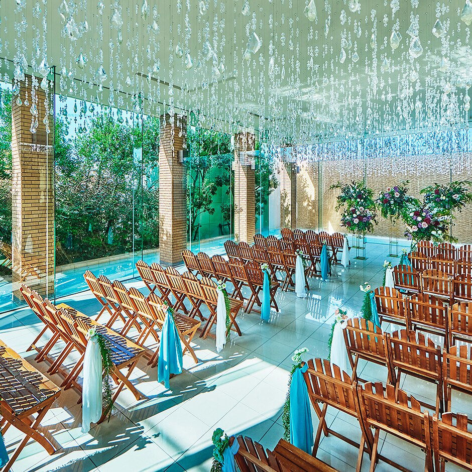 三方をガラスで囲み、陽光と水のせせらぎが空間内を優しく包み込むチャペル。木のぬくもりに溢れ、窓の向こうは緑が広がるナチュラル空間に、光を反射してキラキラとクリスタルが輝き、ふたりをより一層煌めかせる。