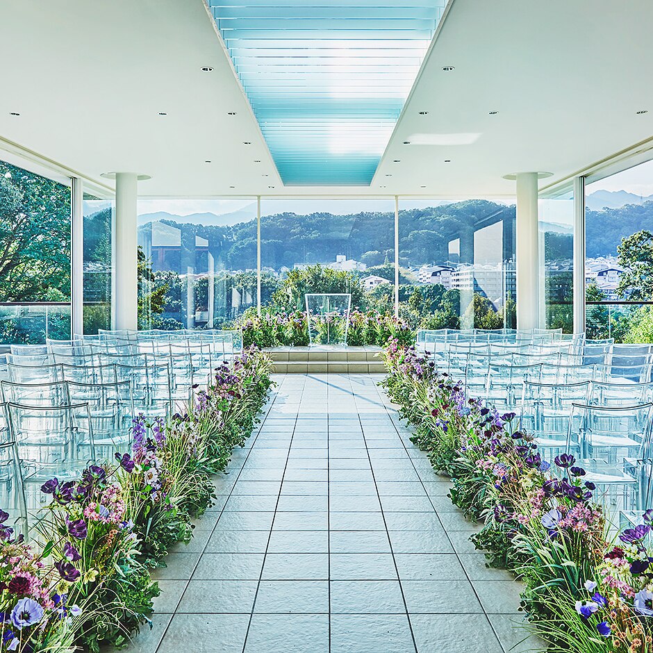 ガラス張りの透明感溢れる空間が、花嫁をより一層美しく魅せる