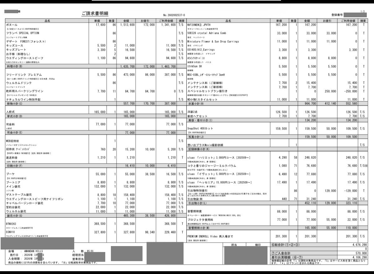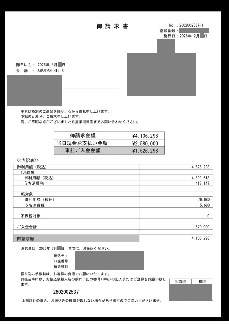 ※料金実例では申込金などを含む会場に支払った"総額"を表示しています。また、料金明細画像の項目名をもとに独自の基準で分類しています。