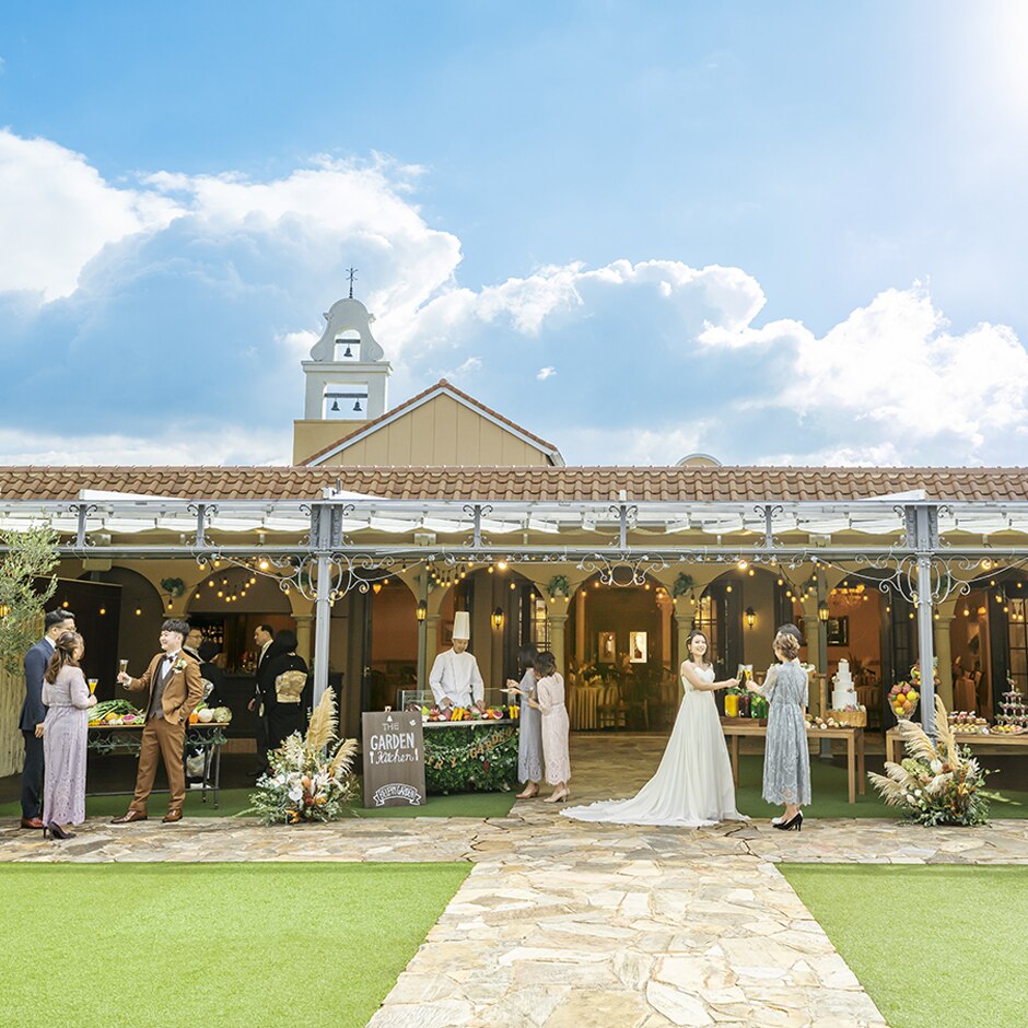 ガーデンの緑と青空が広がる開放的な空間で幸せで和やかな雰囲気が溢れる