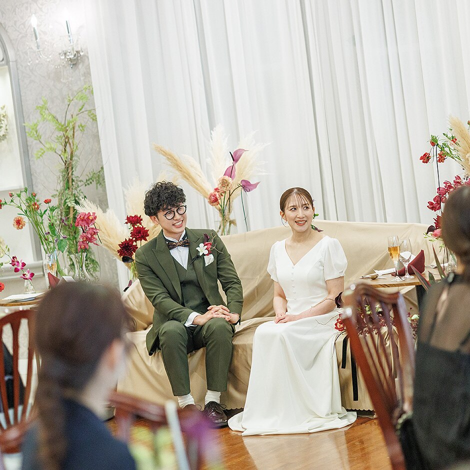 2部ご友人とのパーティーはドレスとタキシードの装いでメインバックも雰囲気を変えて -