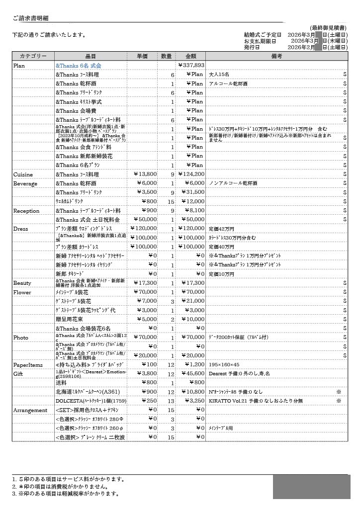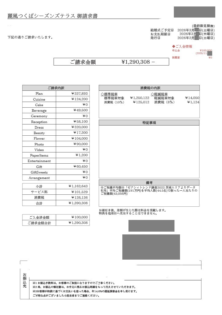 ※投稿された金額情報は、日取り、申込みのタイミングや会場の空き状況等によって異なるため、最終費用明細の項目や金額をもとにした、式場との価格交渉や追加サービス等の要望はご遠慮ください。