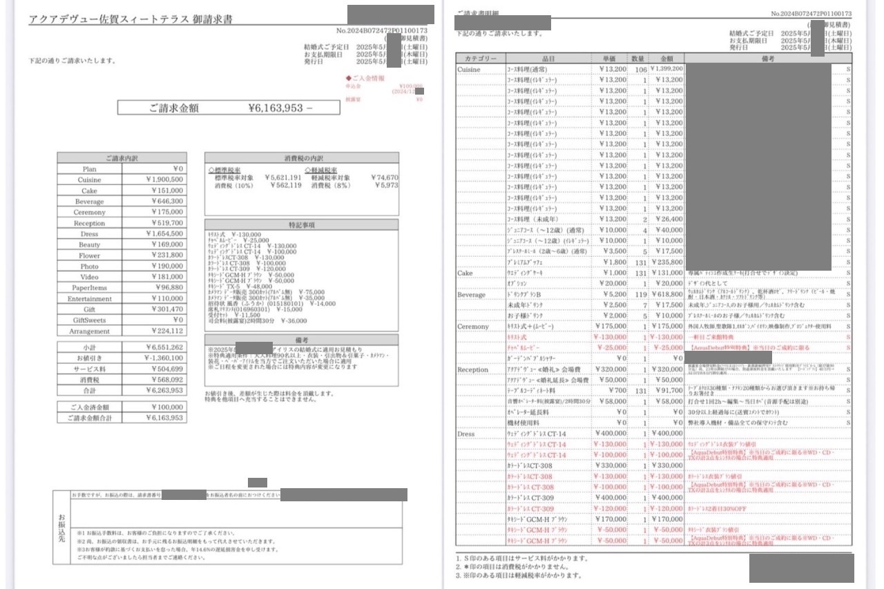 ※投稿された金額情報は、日取り、申込みのタイミングや会場の空き状況等によって異なるため、最終費用明細の項目や金額をもとにした、式場との価格交渉や追加サービス等の要望はご遠慮ください。