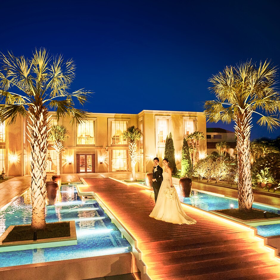 迎賓館のようなアイアンゲートの先に彩られた水辺とパームツリー。海外リゾートに訪れたような非日常を感じる上質な空間で、ワンランク上の花嫁を演出。無料シャトルバスがあるからおもてなし重視のふたりも安心!