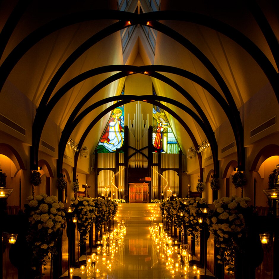 富士山も望める広大な高台の上に堂々とそびえ立つ教会。ヨーロッパ直輸入のアンティークで揃えられた椅子やステンドグラスが、本物へのこだわりの証。ふたりの幸せを祈る意味がつまったチャペルで特別な誓いを。