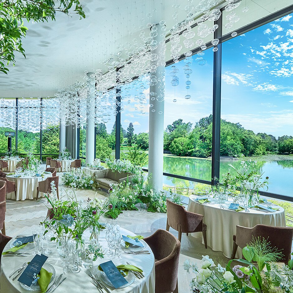 自然に囲まれた『フォレストサイドテラス(写真)』と大理石やゴールドの柱が彩る『レイクサイドテラス』。好みの会場を貸切に、フランスの星付きレストラン出身のシェフが腕を振るう絶品料理を堪能してもらおう。