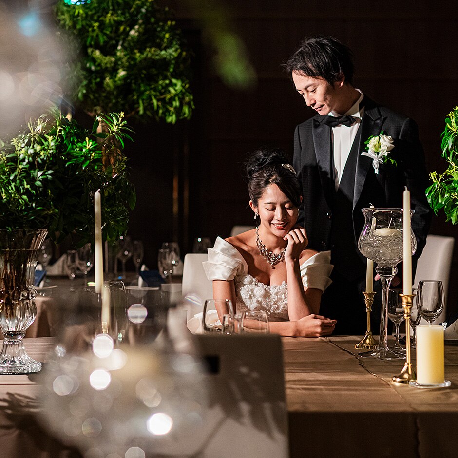 「遠方から来てくださるゲストが、温泉も楽しめて宿泊もできれば最高のおもてなしになると思い、選びました」。自然に囲まれた会津東山の温泉付きホテルは、広々とした披露宴会場もあり、感染対策の面でも安心できたこともポイントに。子どもの頃に憧れた結婚式を思わせる、クラシカルで格式高い会場の雰囲気にも惹かれた。