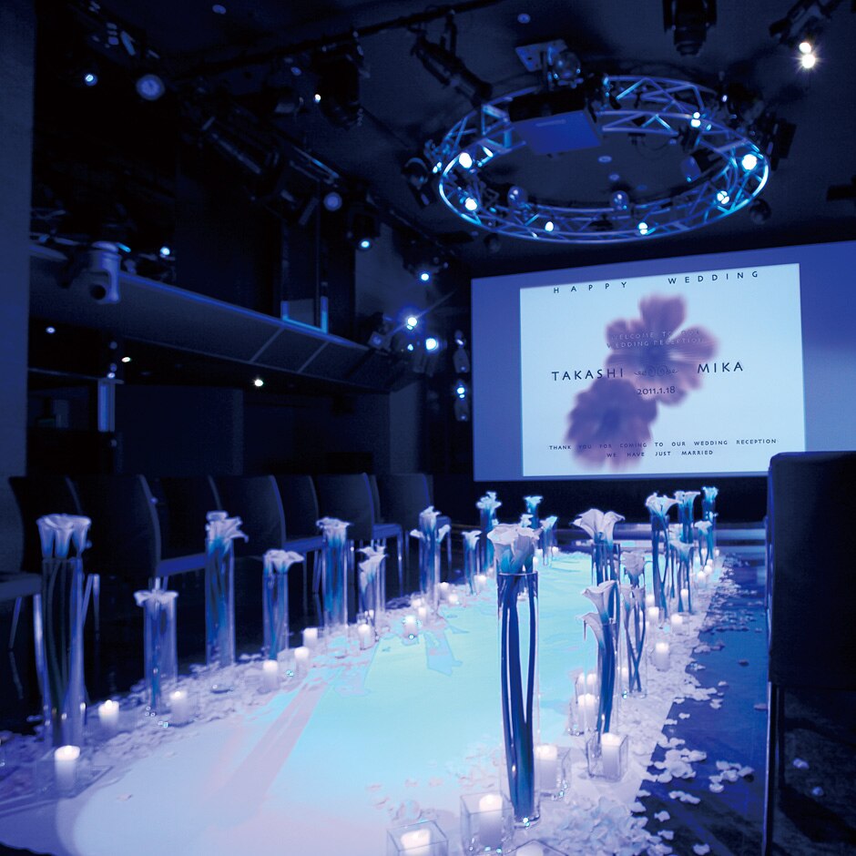 5面スクリーンやプロ仕様の音響照明設備などを駆使して、ふたりらしい自由度の高いウエディングを実現