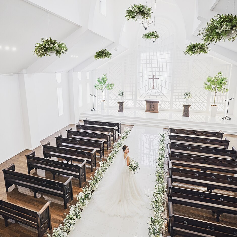 柔らかな陽光が差し込み天井高のある純白チャペル。大切な招待ゲストと感動のひと時を -