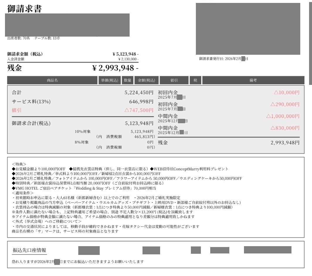 ※投稿された金額情報は、日取り、申込みのタイミングや会場の空き状況等によって異なるため、最終費用明細の項目や金額をもとにした、式場との価格交渉や追加サービス等の要望はご遠慮ください。