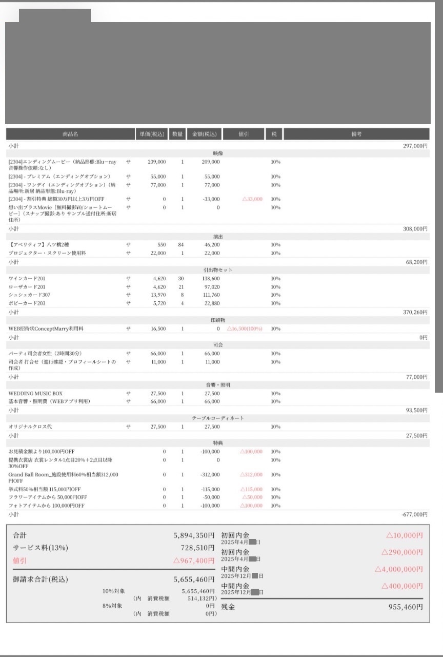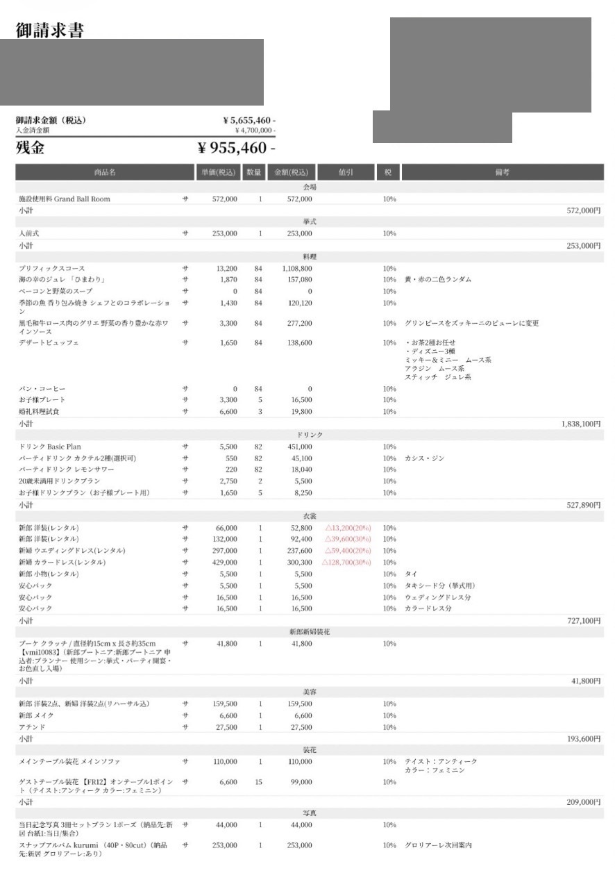 ※料金実例では申込金などを含む会場に支払った"総額"を表示しています。また、料金明細画像の項目名をもとに独自の基準で分類しています。