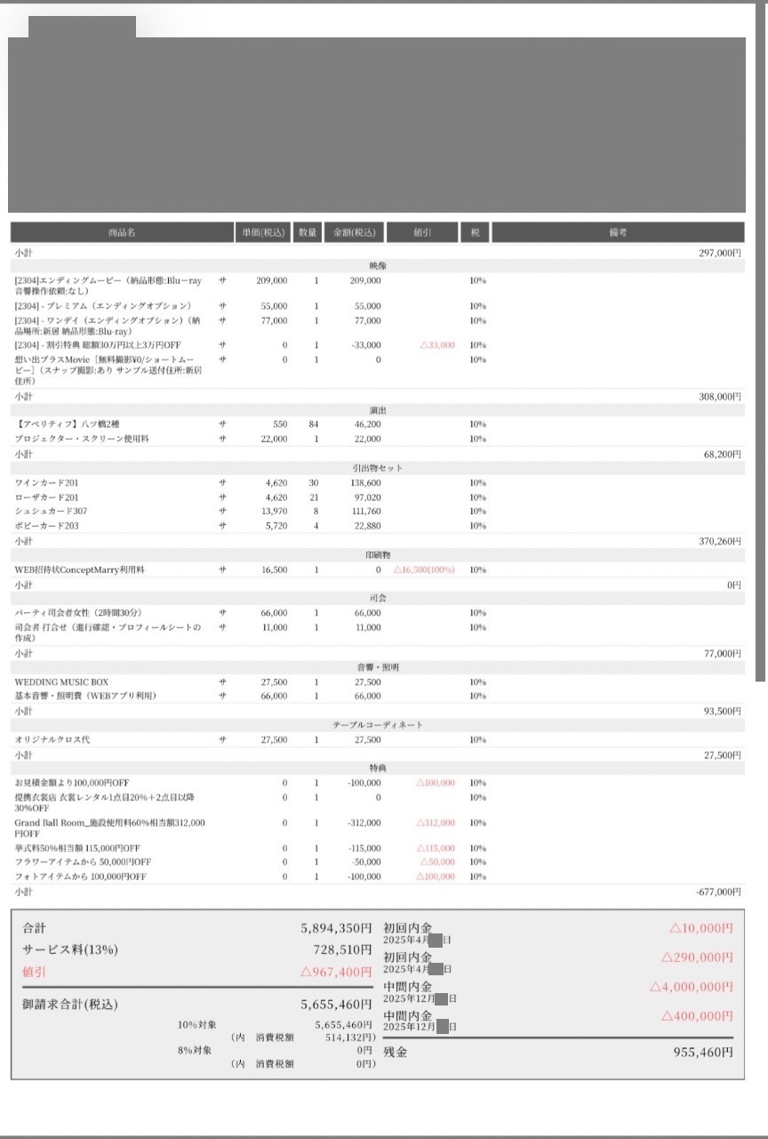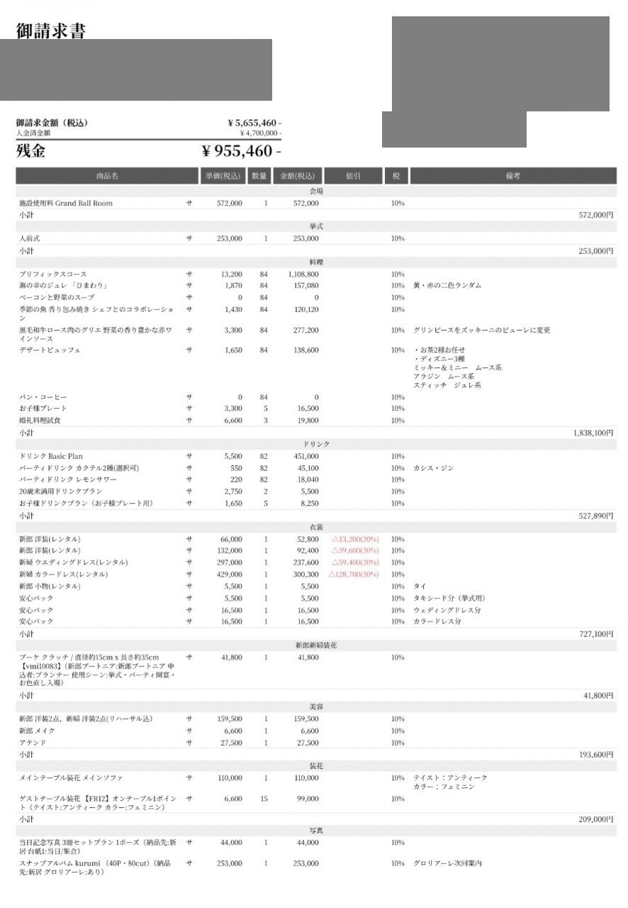 ※料金実例では申込金などを含む会場に支払った"総額"を表示しています。また、料金明細画像の項目名をもとに独自の基準で分類しています。