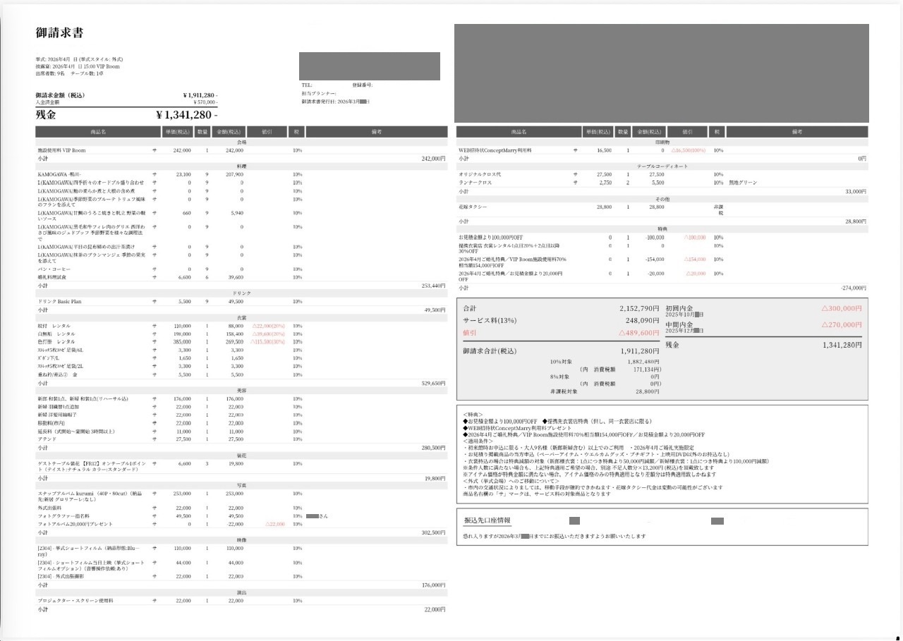 ※料金実例では申込金などを含む会場に支払った"総額"を表示しています。また、料金明細画像の項目名をもとに独自の基準で分類しています。