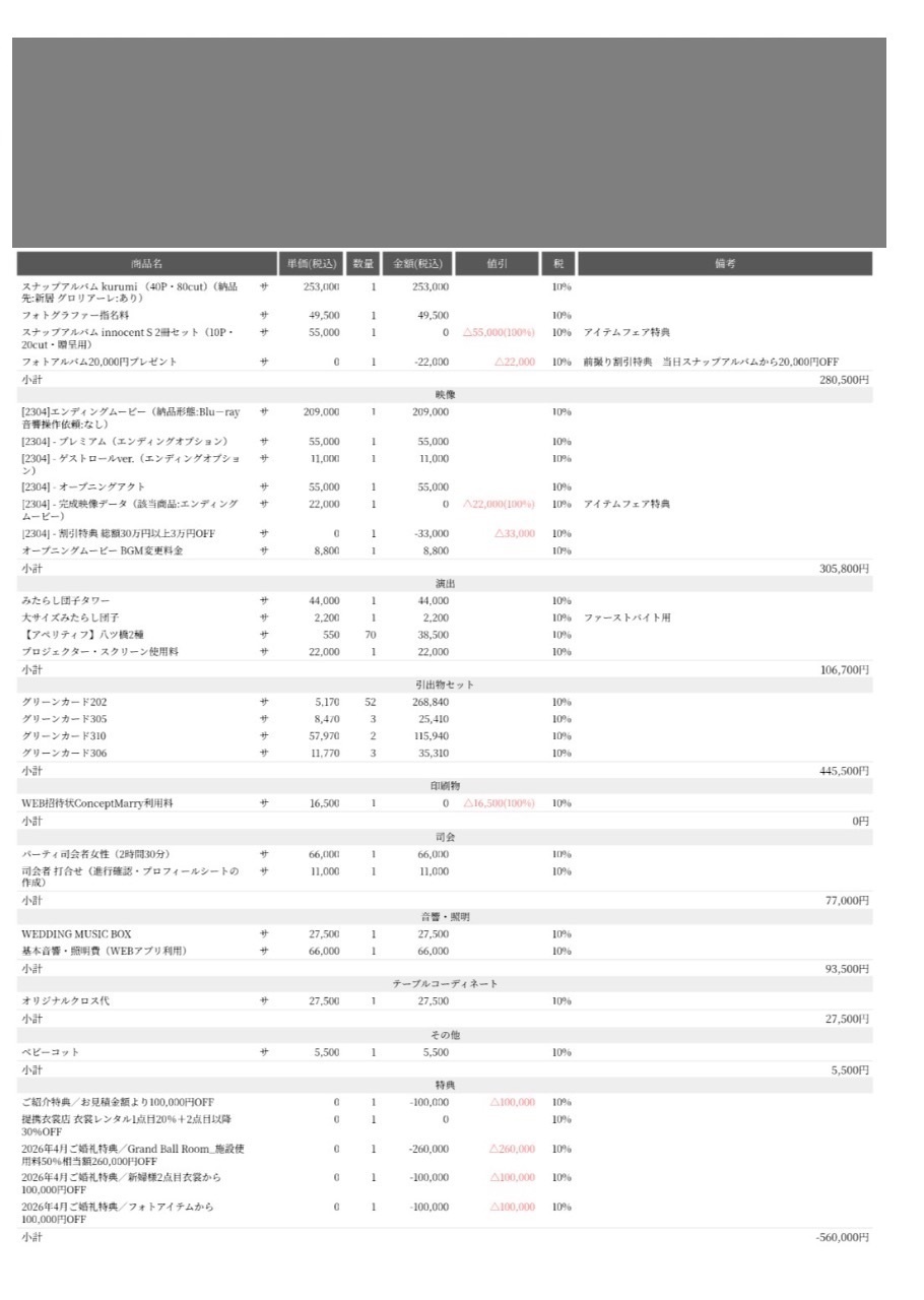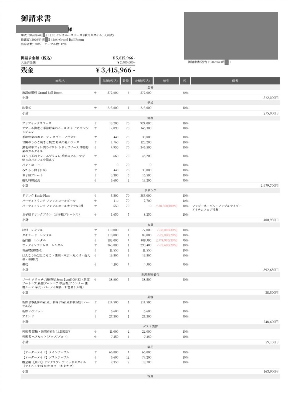 値上がりしたポイントは料理と衣装。料理は少しアップグレードした見積もりも出してもらったが、相場上限ぐらいで最初から見積もってもらうのがいいと思う。