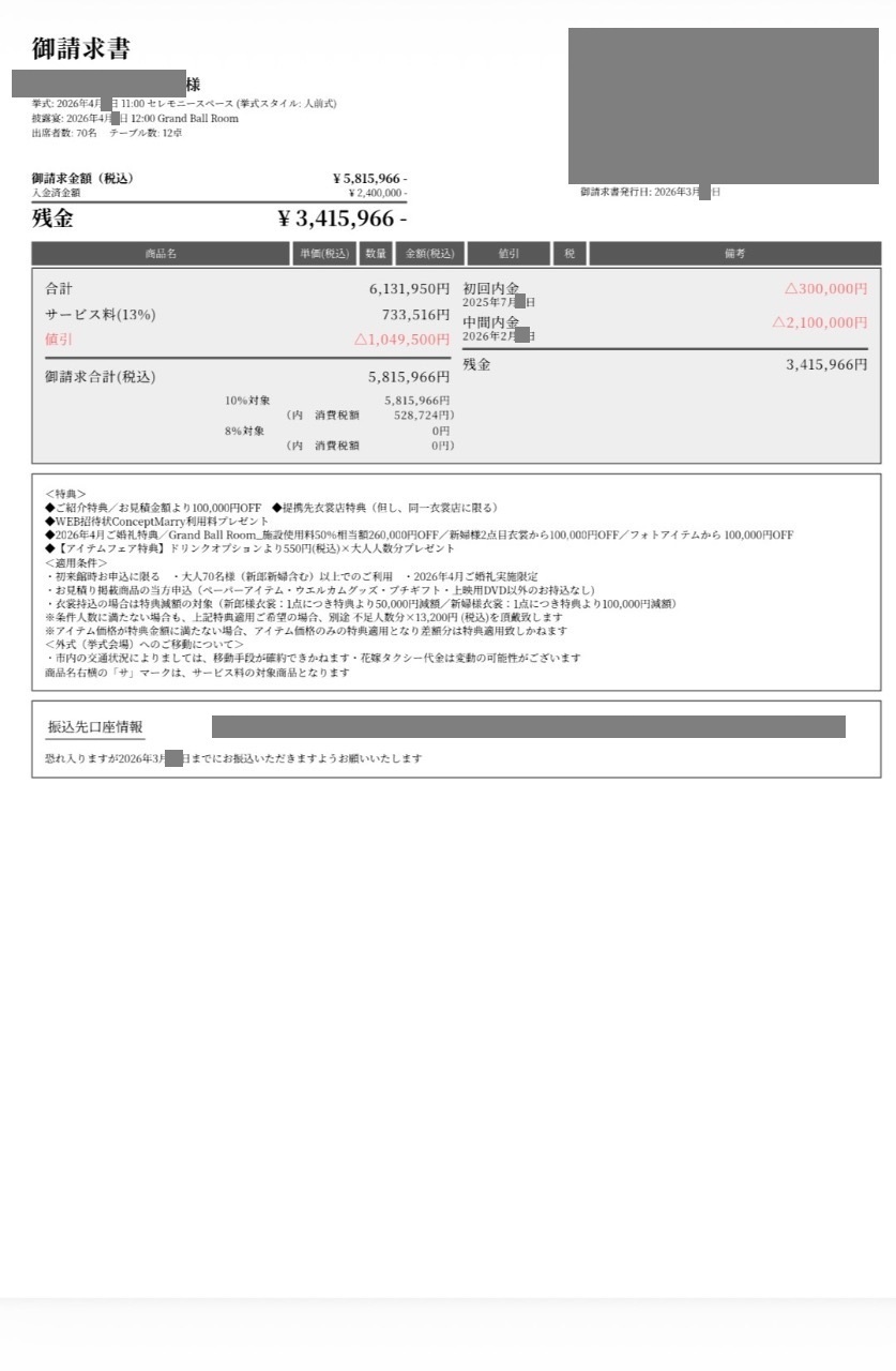 ※投稿された金額情報は、日取り、申込みのタイミングや会場の空き状況等によって異なるため、最終費用明細の項目や金額をもとにした、式場との価格交渉や追加サービス等の要望はご遠慮ください。