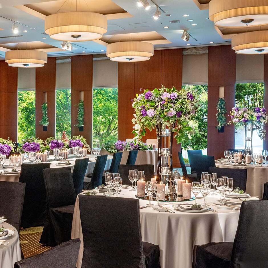 コーディネートはプロフェッショナルなフラワーアーティストと共にふたりらしく創り上げて。「浜離宮」は四季を感じるプライベートガーデンが人気。ボールルーム「風波」は天井高7.2mを誇り、贅沢な大人の祝宴が叶う