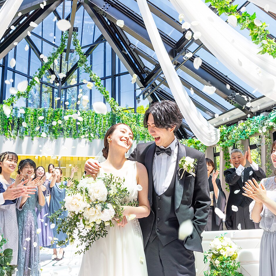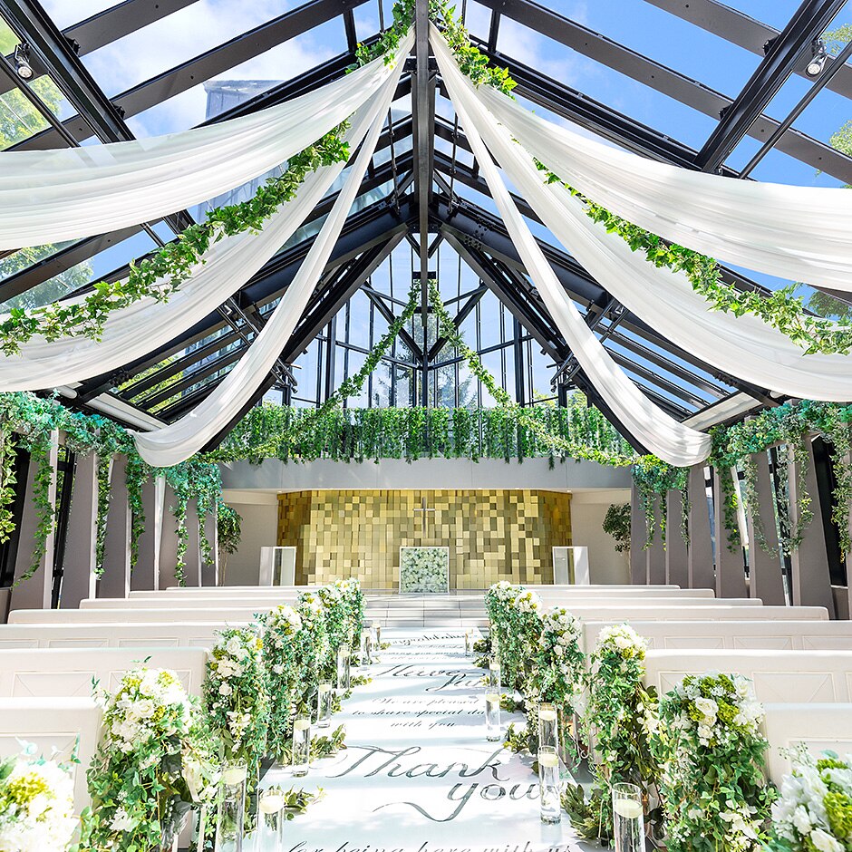青空からまばゆい光が降り注ぎ、柔らかな空気に満ちた開放感溢れるチャペルは全面ガラス張り。窓の外には緑や花々が咲きほこる豊かな自然が広がり、ふたりもゲストも肩ひじ張らずにセレモニーを迎えられるのが魅力。
