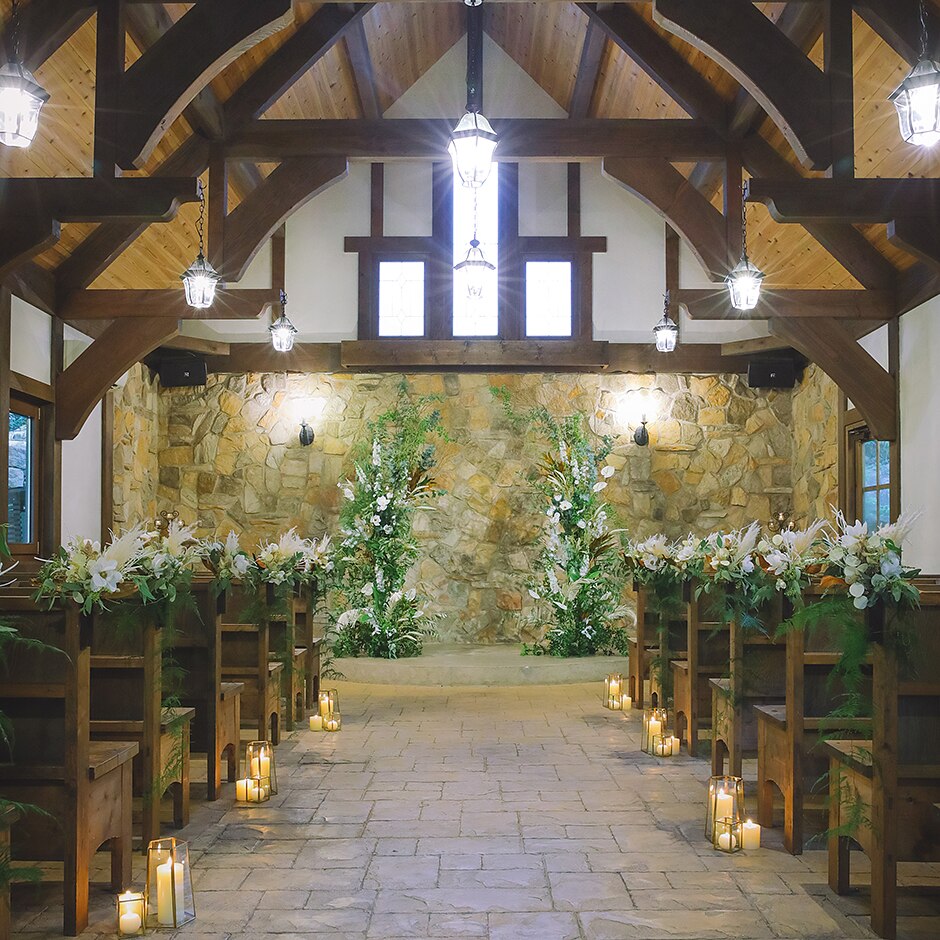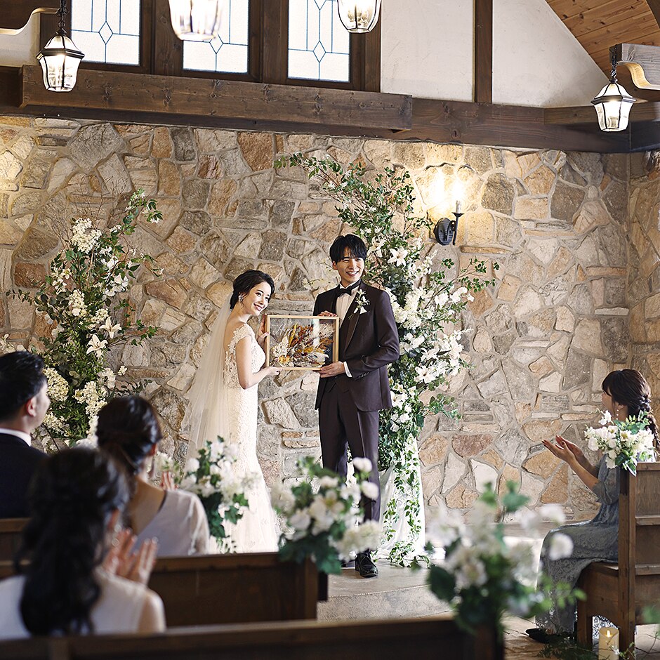 はちみつ色の石組みや木の質感、アンティークの温もりを感じられるチャペルでは、ゲストからの祝福をすぐ近くに感じられる距離感で温かなセレモニーが叶う。教会式はもちろん、ゲスト全員に誓う人前式も大人気