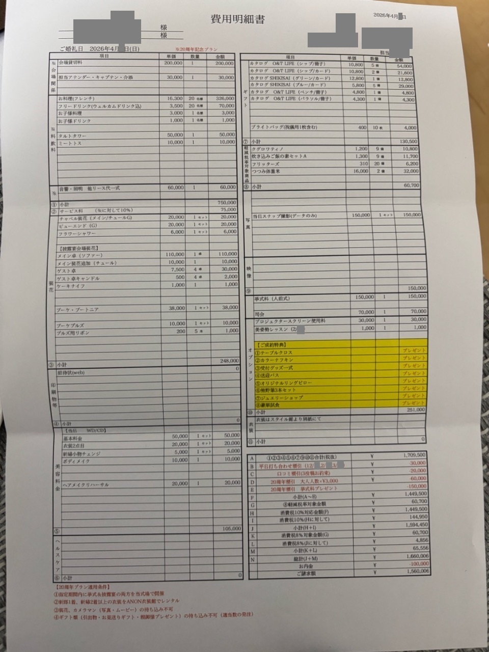 ※投稿された金額情報は、日取り、申込みのタイミングや会場の空き状況等によって異なるため、最終費用明細の項目や金額をもとにした、式場との価格交渉や追加サービス等の要望はご遠慮ください。