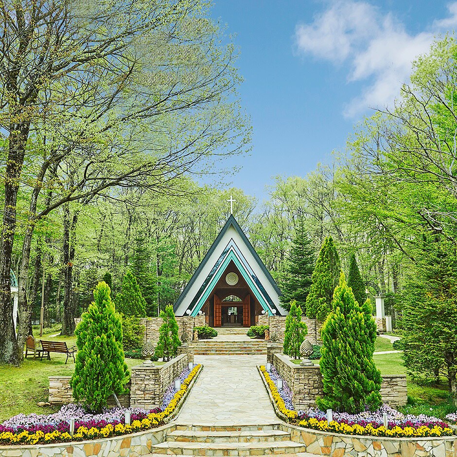 木々に抱かれるように佇む三角屋根の教会。森の四季がふたりの誓いの時を彩り、忘れられない一日に